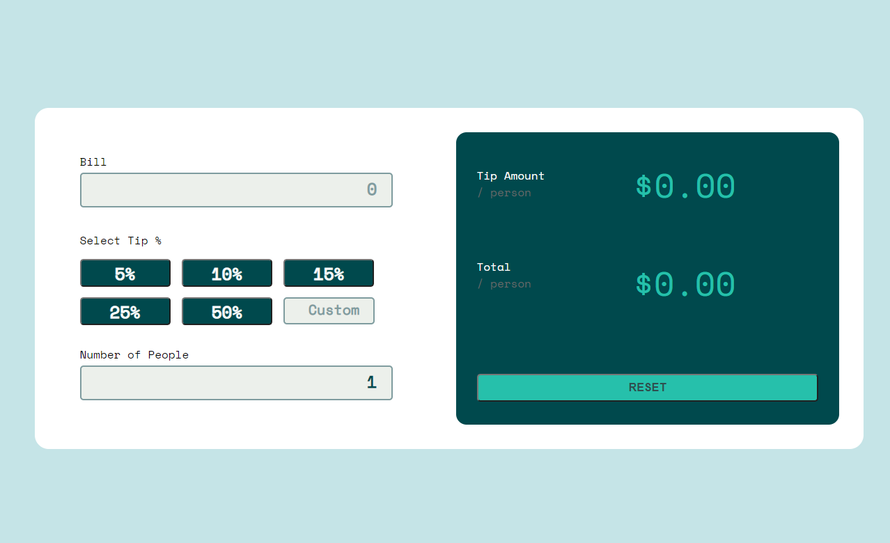 This project was completed as part of a front-end coding challenge. A tip calculator built with HTML5, CSS3, and JavaScript. Calculator functionality includes a tip calculation based on price, desired tip percentage, and number of contributers. This project includes a meticulously designed user interface with modern style elements.